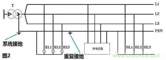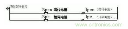 在這樣的供電系統中地線和零線合二為一稱之為PEN線,值得注意的是這種系統中的PEN線需要在配電網中重復接地形成一個接地網,以保證PEN線的零電位。