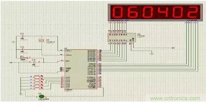 使用單片機的P2口進行數模的輸出,P1^4、P1^5、P1^6與74HC138連接實現數碼管位選,按鍵電路接入P1^0、P1^1、P1^2、P1^3四個IO口,通過程序控制,掃描該四個引腳的信號實現時間的調節。蜂鳴器通過與三極管8550連接,最終接入P1^7,時間設定啟動使其發聲。溫度傳感器接入P3^7,將采集到的模擬信號轉化為數字信號后傳到單片機。