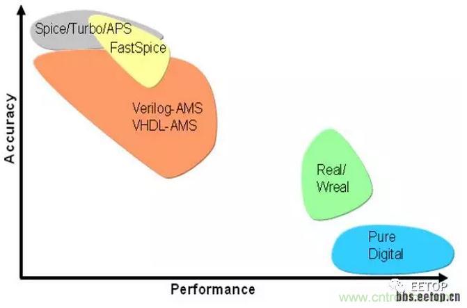 在Verilog-AMS中,我們可以用analog begin...end來建立模擬模型(如:Verilog-A中一樣),但這種建模方式仿真時,AMS Designer Simulator會調用模擬解法器來求解電路,而采用wreal 數據類型的event-driven建模方式,這樣 無論你的模擬電路和數字電路,AMS Designer Simulator都只會調用數字接法器,而大大提高功能級的驗證速度。各個建模方式的性能和仿真速度,如下圖: