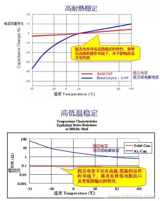 傳統電解電容比較容易受運用環境地溫度和濕度影響,在高低溫穩定性方面稍差。即使是在零下攝氏55度至105度,固態電容地ESR電阻抗可以達到在0.1~0.3歐母,但電解電容則會因溫度而改變。