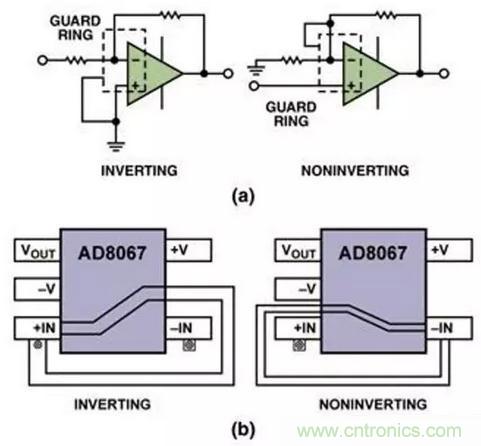 (公式七)保護環,或者稱隔離環,是運算放大器常用的另一種遮罩方法,它用于防止寄生電流進入敏感結點。其基本原理很簡單,用一條保護導線將敏感結點完全包圍起來,導線保持或者迫使它保持(低阻抗)與敏感結點相同的電勢,因此使吸收的寄生電流遠離了敏感結點。(圖十五)(a)顯示了用于運算放大器反相配置和同相配置中保護環的原理圖。圖十五(b)則顯示用于SOT-23-5封裝中兩種保護環的典型佈線方法。