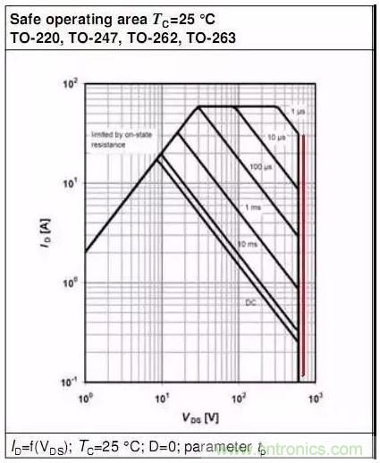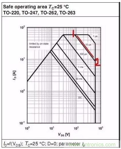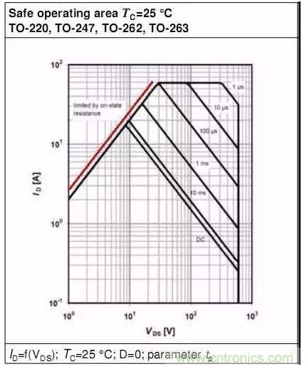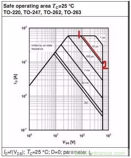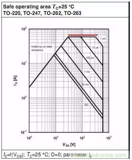 此圖中:當(dāng)VDS=1V時(shí),Y軸對應(yīng)的ID為2A,Rds=VDS/ID=0.5R ==>Tj=150℃時(shí),Rds(on)約為0.5R.當(dāng)VDS=10V時(shí),Y軸對應(yīng)的ID為20A,Rds=VDS/ID=0.5R ==>Tj=150℃時(shí),Rds(on)約為0.5R.所以,此部分曲線中,SOA表現(xiàn)為Tj_max時(shí)RDS(on)的限制.
