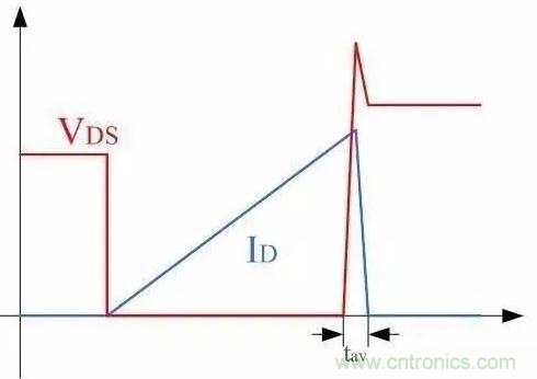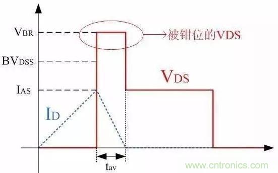 MOSFET雪崩時(shí),波形上一個(gè)顯著的特點(diǎn)是VDS電壓被鉗位,即上圖中VDS有一個(gè)明顯的平臺