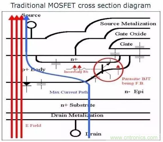在MOSFET的結(jié)構(gòu)中,實(shí)際上是存在一個(gè)寄生三極管的,如上圖。在MOSFET的設(shè)計(jì)中也會采取各種措施去讓寄生三極管不起作用,如減小P+Body中的橫向電阻RB。正常情況下,流過RB的電流很小,寄生三極管的VBE約等于0,三極管是處在關(guān)閉狀態(tài)。雪崩發(fā)生時(shí),如果流過RB的雪崩電流達(dá)到一定的大小,VBE大于三極管VBE的開啟電壓,寄生三極管開通,這樣將會引起MOSFET無法正常關(guān)斷,從而損壞MOSFET。