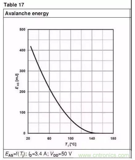計(jì)算出來EAS后,對比datasheet上的EAS值,若在datasheet的范圍內(nèi),則可認(rèn)為是安全的(當(dāng)然前提是雪崩電流<IAR)同時(shí),還得注意,EAS隨結(jié)溫的增加是減小的,如下圖: