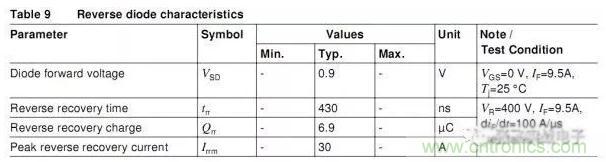 VSD,二極管正向壓降 ==>這個(gè)參數(shù)不是關(guān)注的重點(diǎn),trr,二極管反向回復(fù)時(shí)間 ==>越小越好,Qrr,反向恢復(fù)電荷 ==>Qrr大小關(guān)系到MOSFET的開關(guān)損耗,越小越好,trr越小此值也會小