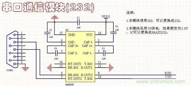 1、雙路232通信電路3線連接方式,對應的是母頭,工作電壓5V,可以使用MAX202或MAX232.