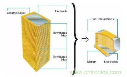 片式多層陶瓷電容器(MLCC),由內電極、陶瓷層和端電極三部分組成,其介質材料與內電極以錯位的方式堆疊,然后經過高溫燒結燒制成形,再在芯片的兩端封上金屬層,得到了一個類似于獨石的結構體,故MLCC也常被稱為“獨石電容器”。