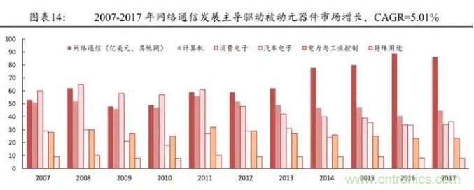 從被動元件的發展歷程來看,近些年來,產業鏈下游的需求擴大主導著被動元件市場的擴張。金融危機以來,全球電子元件市場規模的增長主要來自于網絡通信與汽車電子,尤其是智能手機。