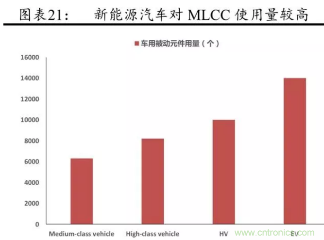電動汽車對 MLCC 元件的需求量巨大,其中動力系統帶來的MLCC增量較為顯著。據前瞻研究院的數據,每輛汽車使用的電子元件,中端車平均為 6300 個,高端車為 8200 個,純電動汽車增加到14000個,其中有一半是 MLCC,這意味著隨著新能源汽車的不斷普及,MLCC 需求量會不斷增長。
