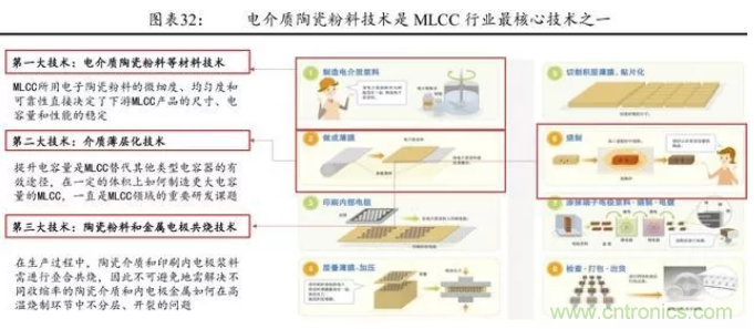 電介質陶瓷粉料 的材料技術、介質薄層化技術、陶瓷粉料和金屬電極的共燒技術被譽 為 MLCC 行業最核心的三大技術。