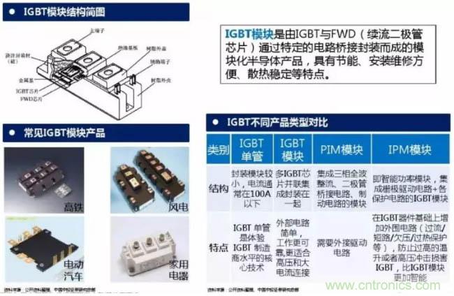 IGBT模塊是由IGBT與FWD(續流二極管芯片)通過特定的電路橋接封裝而成的模塊化半導體產品,具有節能、安裝維修方便、散熱穩定等特點。