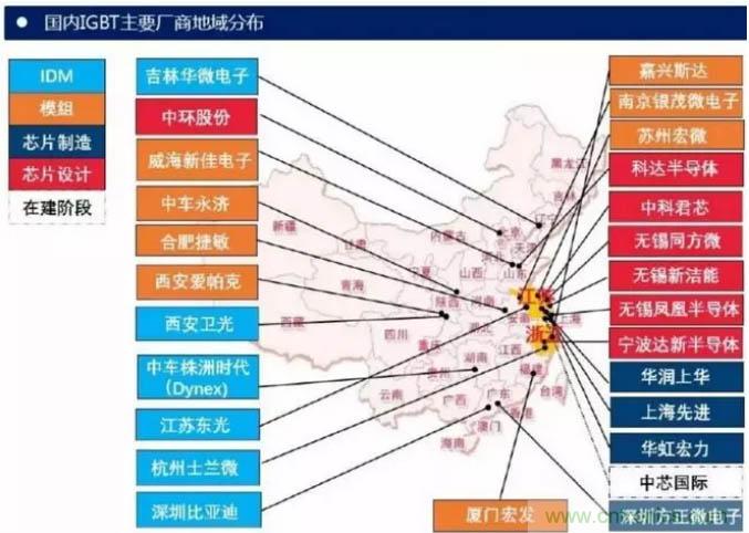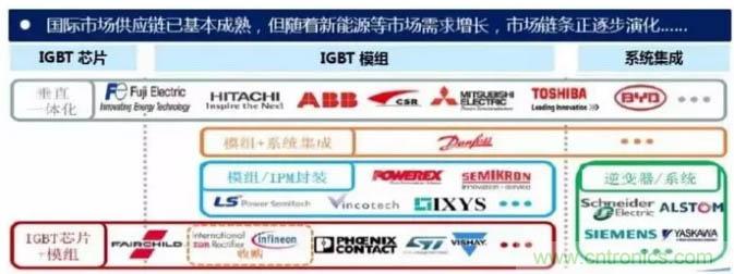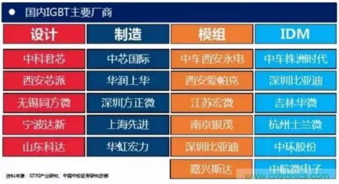 從公司來看,國外研發IGBT器件的公司主要有英飛凌、 ABB、三菱、西門康、東芝、富士等。中國功率半導體市場占世界市場的50%以上,但在中高端MOSFET及IGBT主流器件市場上,90%主要依賴進口,基本被國外歐美、日本企業壟斷。