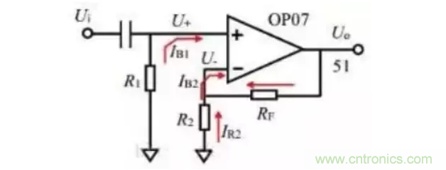 如果 IB1=IB2,那么選擇 R1=R2//RF,可以使電流形成的失調電壓會消失。但實際中IB1=IB2很難滿足