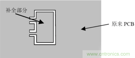 不規則形狀且沒拼板的PCB 應加工藝邊。若PCB 上有開孔大于等于5mm×5mm的地方,在設計時要先將孔補全,以避免焊接時造成漫錫和板變形,補全部分和原有的PCB 部分要以單邊幾點連接,在波峰焊后將之去掉(見圖3.2)