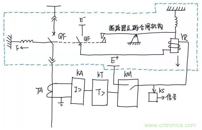下圖是一個用電磁繼電器實現的過電流保護的工作回路。目前我們用的都是微機保護,已經見不到這樣的接線,但可以用它直觀體會保護裝置和工作回路的構成。