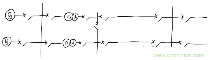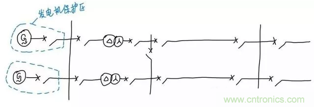 我們繼續往后看。可以看到發電機接到了低壓母線,對于這個低壓母線的保護來說,要做到故障時只停母線而不停其它設備,只要讓保護在故障時切除和母線直接連接的四個斷路器就可以了。所以四個斷路器旁邊的電流互感器圍成的范圍就是這條母線保護的保護范圍。