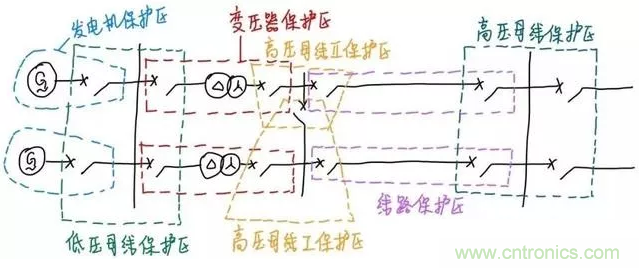 我們發現不同元件的保護區之間有重疊的部分。為了保證任何地方發生故障都在保護區內,這樣的重疊是必要的。如果沒有重疊區,會導致保護出現盲區,造成保護無法正確切除故障元件。但是我們希望重疊區盡可能小,因為重疊區內的故障會造成兩個保護區內所有的開關跳閘,擴大停電范圍。