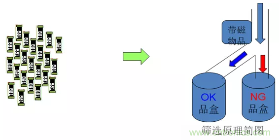 【原理】不良品的磁性小,吸引力小,進(jìn)行篩選時(shí)會(huì)自動(dòng)掉落到不良品盒,良品掉落到良品盒。