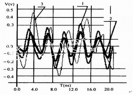 對于圖1所示的兩線系統,我們進行了三種情況的仿真(線網AB上的信號頻率均為100MHz)仿真結果見表3,及圖6.:第一種情況是在兩線間距和平行長度不變的條件下,探測被干擾對象的串擾(標記“1”);第二種情況是在兩線平行長度不變的前提下,將兩線間距增加到10mils,然后探測被干擾對象的串擾標記“2”;第三種情況是在兩線間距不變的條件下,將兩線的平行長度增加到2.6inches標記“3”,然后探測被干擾對象的串擾。由仿真結果可見,當兩線的間距拉大時(P由5mils變為10mils),串擾明顯地減小了,而當兩線的平行長度加長時(L由1.3inches變為2.6inches),串擾顯著增大了。