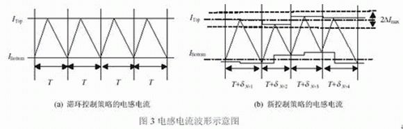 如圖2所示為一種常見的DC/DC控制策略——滯環控制策略。該控制策略限定了電感電流波動的最大值ITop和最小值Ibotton,電感電流波形如圖3a所示。此時,電感電流為周期的,變換器有固定的開關周期T。設電感電流為ILp(t),則