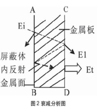 屏蔽的效果與頻率、屏蔽體的幾何形狀、材料性質等因素有關,在分析這些因素并在實際應用屏蔽措施時,金屬屏蔽體對輻射波的衰減作用的機理研究尤為重要。金屬板屏蔽體對電磁波的衰減可由圖2來說明,當電磁波Ei入射到金屬板上時,一部分由AB表面AB反射,另一部分進入金屬體內,而在途中被不斷衰減后達CD面,這時其中又有一部分經E1透過CD面從金屬板內穿出,另一部分則由CD面反射,仍在金屬板內部傳播,同樣有一部分穿過AB面穿出,一部分仍在AB面反射。這樣在金屬板內多次反射和傳播,則透過金屬屏蔽的電磁波總和E-En=Et。