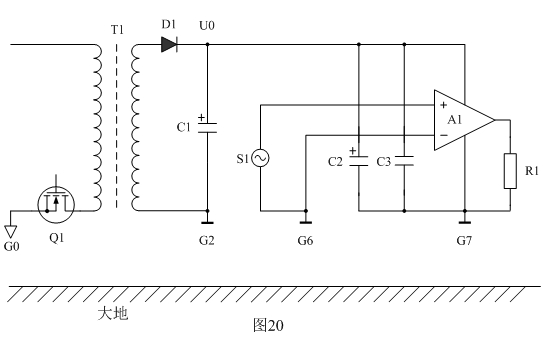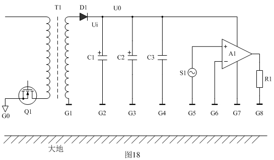 下面我們以圖18為例來分析地線對EMC產(chǎn)生的影響。圖18中Q1表示開關(guān)電源,T1為開關(guān)變壓器,D1為整流二極管,C1、C2、C3為濾波電容器,A1為功率放大器,S1為功率放大器輸入信號,R1為功率放大器輸出負(fù)載,G1、G2、G3、G4、G5、G6、G7、G8為各個(gè)器件的地;Ui表示整流輸出電壓,Uo表示經(jīng)過濾波后的輸出電壓。