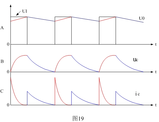 圖19是開關(guān)電源整流輸出電壓以及電源濾波電容的紋波電壓和紋波電流波形。圖19中紅線表示電容器充電時(shí)的電壓、電流變化曲線,藍(lán)線表示電容器放電時(shí)的電壓、電流變化曲線。其中Ui表示整流輸出電壓,Uo表示經(jīng)過濾波后的輸出電壓,uc表示濾波電容的紋波電壓,ic表示濾波電容的紋波電流。