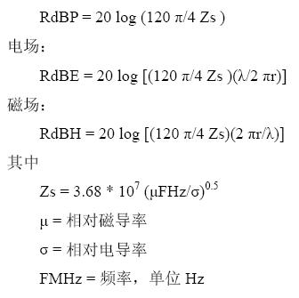 高阻抗源(電場(chǎng))的波阻抗會(huì)大于120π 歐姆,而且它會(huì)隨著間隔距離的增大而逐漸減小,直到極限值。由此,有三個(gè)等式被用于計(jì)算屏蔽體表面的反射。這些等式假設(shè)Zw/Zs 或Zs/Zw >10。當(dāng)λ/2πr或2πr/λ=1 時(shí),電場(chǎng)和磁場(chǎng)等式就變得和平面波的等式一致了。