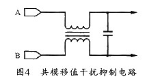 電磁場在導線中感應出的電壓一般是共模電壓,而負載上的電壓則以系統中的公共導體或大地為參考點。一般以系統中的參考地線面為參考點。對于多芯電纜來說,這意味著電纜中的所有導體都暴露在同一個場中,它們上面所感應的電壓取決于每根導體與參考點之間的阻抗。抑制干擾的方法可以使用共模移值法,其原理圖如圖4所示。