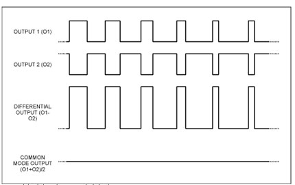 如圖1所示,如果器件的反相和同相輸出回路具有較高的匹配度,則兩個對稱輸出信號波形在揚聲器或連線上將具有很小的共模(CM)信號(底部的跡線)。注意:50%占空比代表零輸入信號(空閑狀態(tài))。因此,可以設計一個差分低通濾波器,用于衰減信號波形中高頻分量(快速切換所產生的),同時保留有用的低頻分量以輸出到揚聲器。