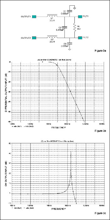 圖5b為圖5a濾波器對差分輸入的響應,圖5c為共模輸入的響應。注意:圖5c中共模截止頻率較高(-3dB帶寬約為110kHz,差分輸入為28kHz),帶有平緩且合理控制的尖峰。該截止頻率遠高于最高音頻(也低于D類開關頻率基波),因此具有較好的效果。