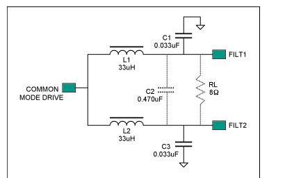 此類D類放大器對輸出濾波器的要求,不同于具有傳統(tǒng)差分輸入和互補PWM輸出的放大器。與PWM相比,MAX9704調制方案的輸出往往含有較高的共模信號,設計輸出濾波器時需要考慮這點。正如后面的實例所示,傳統(tǒng)差分濾波器拓撲結構的效果往往不太理想。