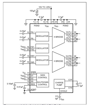 圖2.Maxim的MAX9704立體聲D類放大器的調制方案