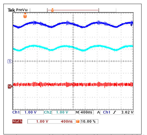 8.頂部跡線顯示了圖5a電路輸出中殘余的紋波電壓,紋波成分主要為開關頻率基波(此時為940kHz)。濾波器高于該頻點的二階滾降很好的抑制了所有高次諧波。紋波幾乎只有共模分量(底部的跡線)。
