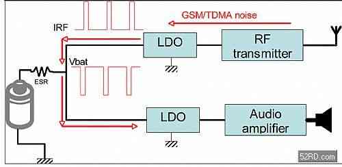 防止GSM噪聲降低音頻質量的最佳方法,就是使用具有很低壓降(LDO)和低輸出噪聲的線性穩(wěn)壓器(LR)從鋰離子電池直接給音頻放大器供電。這種LDO線性穩(wěn)壓器用作放大器電源的“清理”或濾波模塊。