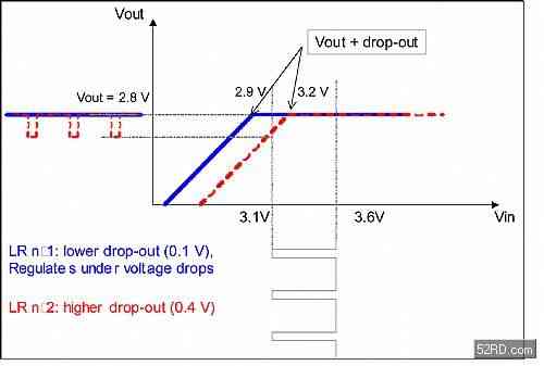 從圖2可以看到,電池電壓的500mV瞬變將如何依據線性穩(wěn)壓器的有效壓降轉移到LDO輸出端。第1行的線性穩(wěn)壓器(藍色實線)具有小于100mV的壓降,因此它保持在穩(wěn)壓狀態(tài)。相反,第2行的線性穩(wěn)壓器(紅色虛線)不能維持這樣的壓降,因為它要求輸入和輸出電壓之間至少有400mV的壓差。