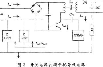 如圖2所示,當(dāng)開關(guān)管轉(zhuǎn)為“關(guān)”時,集電極與發(fā)射極間的電壓快速上升達(dá)500V,他產(chǎn)生的電流經(jīng)集電極與地之間的分布電容返回整流橋,這個按開關(guān)頻率工作的脈沖串電流是共模噪聲。這個電壓會引起共模電流Icm2向CP2充電和共模電流Icm1向CP1充電,其中CP1為變壓器初、次級之間的分布電容,CP2為開關(guān)電源與散熱器之間的分布電容(即開關(guān)管集電極與地之間的分布電容)。則線路中共模電流總大小為Icm1+Icm2。