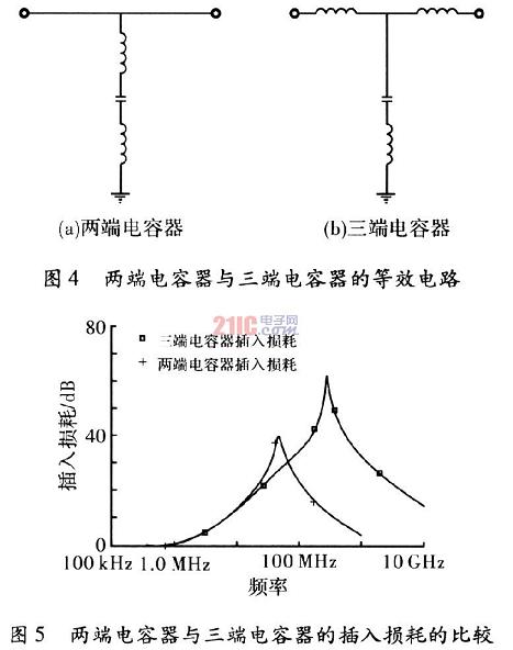 通常采用旁路電容抑制高頻噪聲。實(shí)際的電容器不僅具有電容C,還有等效串聯(lián)電阻ESR和等效串聯(lián)電感ESL。由于寄生電感的影響,對于一個(gè)實(shí)際的電容存在著自諧振頻率。在這個(gè)頻率以上時(shí),電容呈感性。元件的寄生參數(shù)也會(huì)極大地影響濾波器的高頻特性。電容的寄生電感是主要的寄生參數(shù),而對于電感來說,寄生電容是主要的寄生參數(shù)。電容器用作旁路電容時(shí),如圖4(a)所示,兩端電容器一端接地,另一端與信號(hào)線連接。三端電容器一端接地,其余兩端與電容器的一個(gè)電極相連并串聯(lián)到信號(hào)線上,如圖4(b)所示。一般的兩端電容器由于與其電路連接的引線電感或電極所產(chǎn)生的等效串聯(lián)電感較大,所以自諧振點(diǎn)較低,旁通效應(yīng)也隨之降低。采用三端電容器可有效改善此缺陷。原因在于三端電容器中流入地的電流與信號(hào)線中電流方向正交,所以其寄生電感比兩端電容降低約50%,并且其中70%以上的寄生電感轉(zhuǎn)移到信號(hào)線上。因此提高了三端電容器的自諧振頻率,也可以將它作為T形濾波器使用,更好地抑制高頻噪聲。三端電容器的地線電感起著不良作用,作為旁路電容抑制高頻噪聲時(shí),宜采用無引線的片式陶瓷電容器。圖5為兩端電容器與三端電容器插入損耗的比較。
