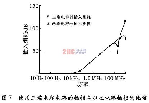 取差模電容Cx為0.1μF,共模電容Cy為2200pF,共模電感L取8mH。三端電容的等效串聯(lián)電感ESL取0.36nH。在50 Ω/50 ΩQ系統(tǒng)中分別對一般結(jié)構(gòu)的EMI濾波器和使用了三端電容器的EMI濾波器的插入損耗進(jìn)行PSpice仿真。如圖7所示,EMI濾波器在使用三端電容時(shí),諧振點(diǎn)之后的插損效果明顯好于在濾波器中使用兩端電容的插損。提高了濾波器在高頻段的性能。