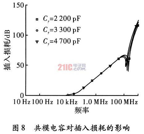 在使用三端電容的濾波器電路中,輸入阻抗和輸出阻抗都取50時(shí),分別取共模電容Cy為4700pF,3300pF和2200pF,其他參數(shù)不變,觀察共模電容Cy變化時(shí)對插入損耗的影響。通過圖8的仿真結(jié)果看出,隨著共模電容的增大,在高頻段插入損耗有所提高,并且濾波器諧振點(diǎn)降低;而在低頻段基本沒有變化。因此可以通過選擇較大的共模電容來提高濾波器高頻段的插入損耗。由于共模電容需要接地,有漏電流,Iid的存在,對人身安全存在威脅。而共模電容越大,漏電流越大,所以選擇共模電容時(shí)需要在漏電流滿足安全條件的情況下取值。