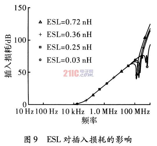 考察三端電容器與信號(hào)線串聯(lián)的等效串聯(lián)電感ESL對插入損耗的影響。取共模電容Cy為3 300 pF,取ESL分別為0.03 nH,0.36 nH和0.72 nH,其他參數(shù)值不變。從圖9的仿真結(jié)果可以看出,隨著ESL降低,諧振點(diǎn)提高,諧振點(diǎn)之后的插入損耗下降。