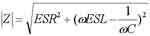 隨著電路系統時鐘頻率的增加,很多情況就不能按照理想的電容器來考慮了。一個實際的電容不論是陶瓷電容還是電解電容,都可以被簡化成一個串聯RLC的模型。一個電容模型包括自身的電容C,還包括了等效的串聯電感ESL和等效串聯電阻ESR這兩個重要的參數。這個串聯模型的阻抗幅值是: