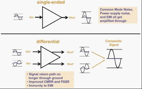 首先談到單端和差分信號的概念,這個大家都比較了解了。這里我們用另外一種方式來表達,我們可以將信號分為不平衡信號或平衡的信號,單端信號屬于不平衡信號,因為它是單側信號,所以是相對地而言的,沒有與之平衡的信號對,相比平衡信號,不平衡的信號呢一般會產生較高的諧波失真。
