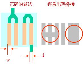 [page]5.如果相鄰的焊盤需要相連,首先確認在外面進行連接,防止連成一團造成橋接,同時注意此時的銅線的寬度。