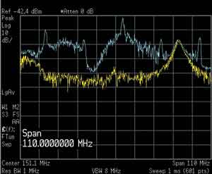 幸運的是,測量技術的發展已經可以滿足這些需求。上面介紹了如何使用實時頻譜分析儀發現瞬態信號和EMI隱患。在下面的實例中,單個的瞬態信號會產生一串瞬態信號,這些信號每次只持續很短的時間。在本例中,該設備是一種嵌入式系統,在把數據緩存到硬盤時導致了瞬態EMI.在使用掃頻分析儀的峰值檢波器簡單檢查后(黃色軌跡,如圖6所示),似乎只有一個連續信號;把儀器保持Max-hold幾分鐘,同時循環DUT工作模式,會指明問題(藍色軌跡)。但在峰值檢波模式下進行快速掃描會得到黃色軌跡,沒有檢測到問題。