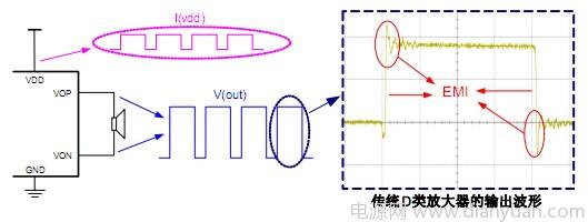 傳統(tǒng)D類放大器開關(guān)輸出的拓?fù)浣Y(jié)構(gòu)是一個很好的EMI發(fā)射源:如調(diào)制的開關(guān)信號,開關(guān)信號的邊沿變化,電源線上變化的電流信號等都會產(chǎn)生大量的EMI,如下圖所示。