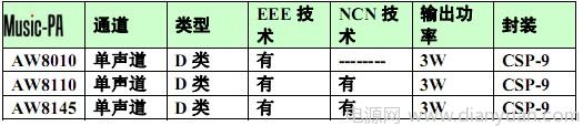 高效率、低功耗使得D類放大器的應(yīng)用越來越廣泛,D類放大器EMI也越來越受到關(guān)注。采用艾為帶有EEE技術(shù)的AW8010、AW8110、AW8145,極大地降低了EMI的輻射,簡化了設(shè)計。其中音樂功放AW8110、AW8145同時還采用了獨特的、擁有專利保護的無破音(NCN:Non-Crack-Noise)技術(shù),提高音質(zhì)的同時有效地保護揚聲器,是音樂手機等便攜式設(shè)備的理想選擇。