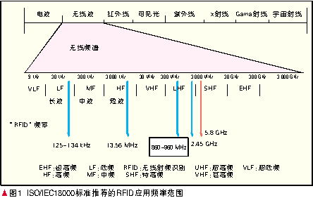 圖1顯示了ISO/IEC18000標準推薦的RFID應用頻率范圍,從圖上可以看出RFID系統分為低頻(LF)125~134 kHz、高頻(HF)13.56 MHz、超高頻(UHF)860~960 MHz與2.4 GHz和微波頻段(MW)5.8 GHz。