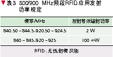 信息產業部于2007年4月23日發布了信部無[2007]205號文件《關于發布800/900 MHz頻段射頻識別(RFID)技術應用試行規定的通知》,規定800/900 MHz頻段RFID技術的具體使用頻率為840~845 MHz和920~925 MHz.表3給出了發射功率的規定。